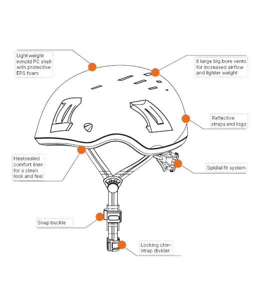 - Certified mountaineering/industrial safety helmet with reflective stickers for top, sides and back