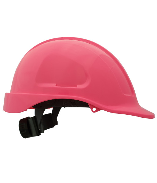 Mid-peak non-vented industrial safety hard hat, ratchet adjustable harness.
