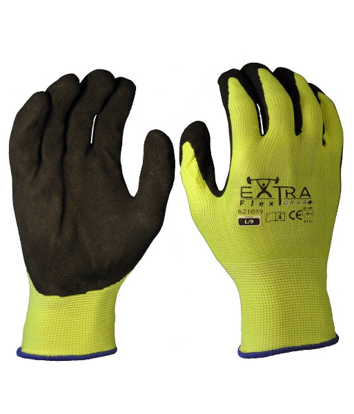 Extra Flex Grab Plus, 13-gauge hi-vis yellow polyester liner double coated with sandy nitrile coating.