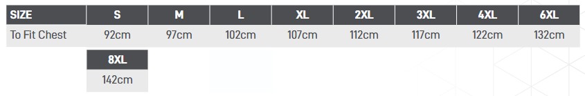 - S, M, L, XL, 2XL, 3XL, 4XL, 6XL, 8XL