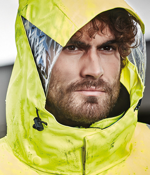 - Concealed hood with unique clear panels to increase peripheral vision while wearing hood